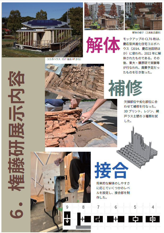 権藤研究室では、活動の背景となる解体材利用の動向や国内外の事例などをパネルにまとめた上で、実際に劣化CLTを補修する技術のプロトタイプや、将来的に解体可能な接合部のプロトタイプを製作・展示しました。