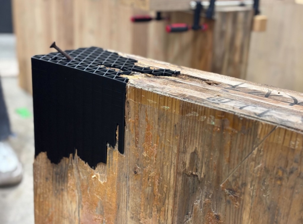 こちらは、池田先生が慶応でつくられたコエボハウスを解体し、その劣化状態を腰原先生が調べていたCLTを、引き取って補修したものです。欠損部を3Dスキャンして、そこに3Dプリントで部材を埋め込むなどしています。