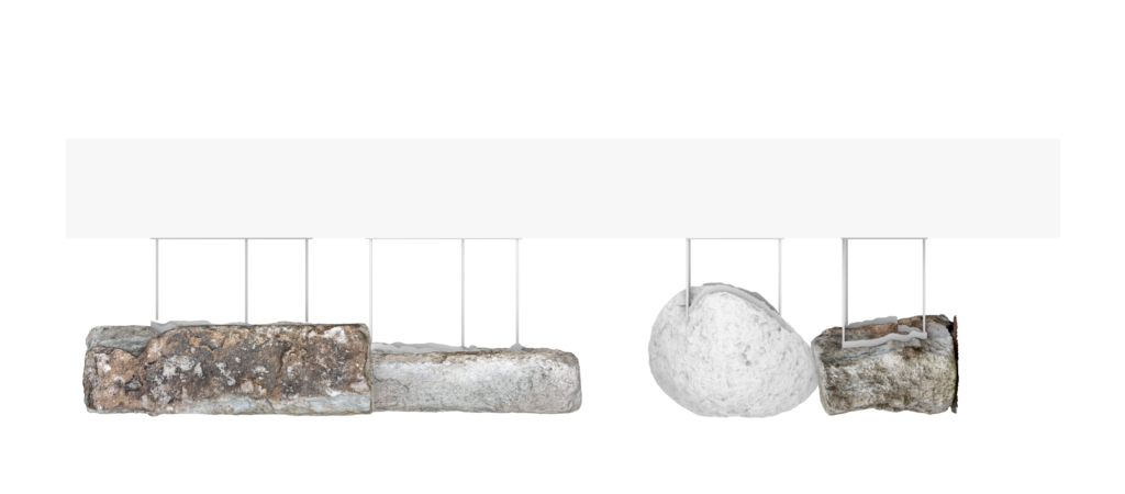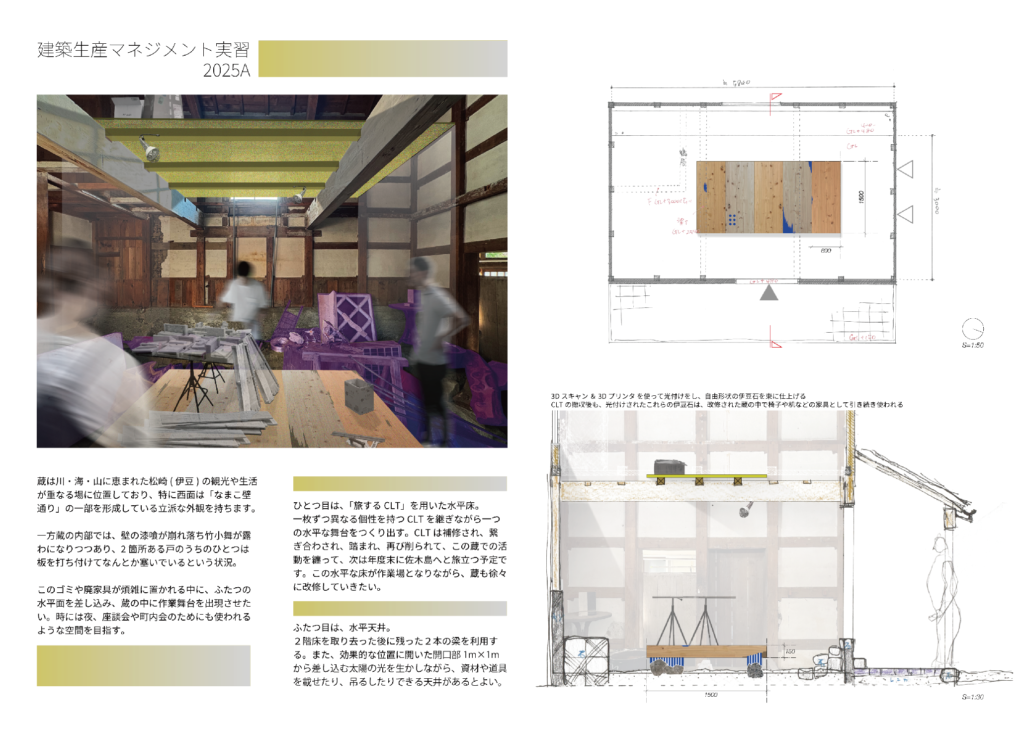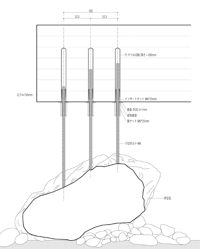 蔵の中に落ちている伊豆石に3Dプリントで光付けをして平らな面をつくり、CLTを載せるというのが設計案です。これを元に履修者が細かい設計や、実際に加工・組立を行ないました。下が設計案です。