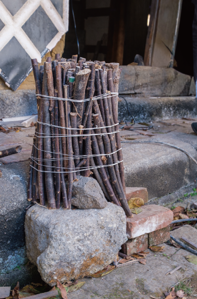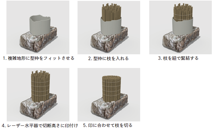 最後に、Nさんが一人でつくった、木の枝を束ねて上下させて石にフィットさせる案です。