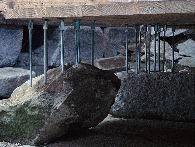 まず石積む案。綺麗に詰めています。2枚のCLTの間は石の束を2またで太くしたり工夫しています。